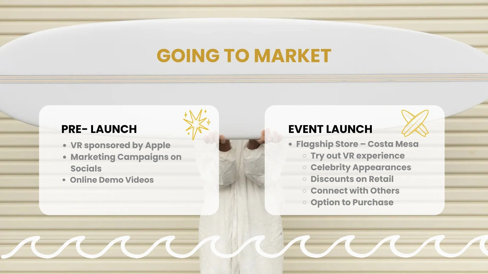 The go-to-market strategy centered on a flagship store launch event at Almond’s Costa Mesa location, where customers could test the VR experience, connect with other surf enthusiasts, and access exclusive retail discounts. Apple was envisioned as a key partner, providing VR headsets for in-store trials and sponsoring elements of the platform’s development. Marketing efforts included partnerships with professional surfers, athlete-driven promotions, VR activations at competitions, and AI-driven customization tools within the app.